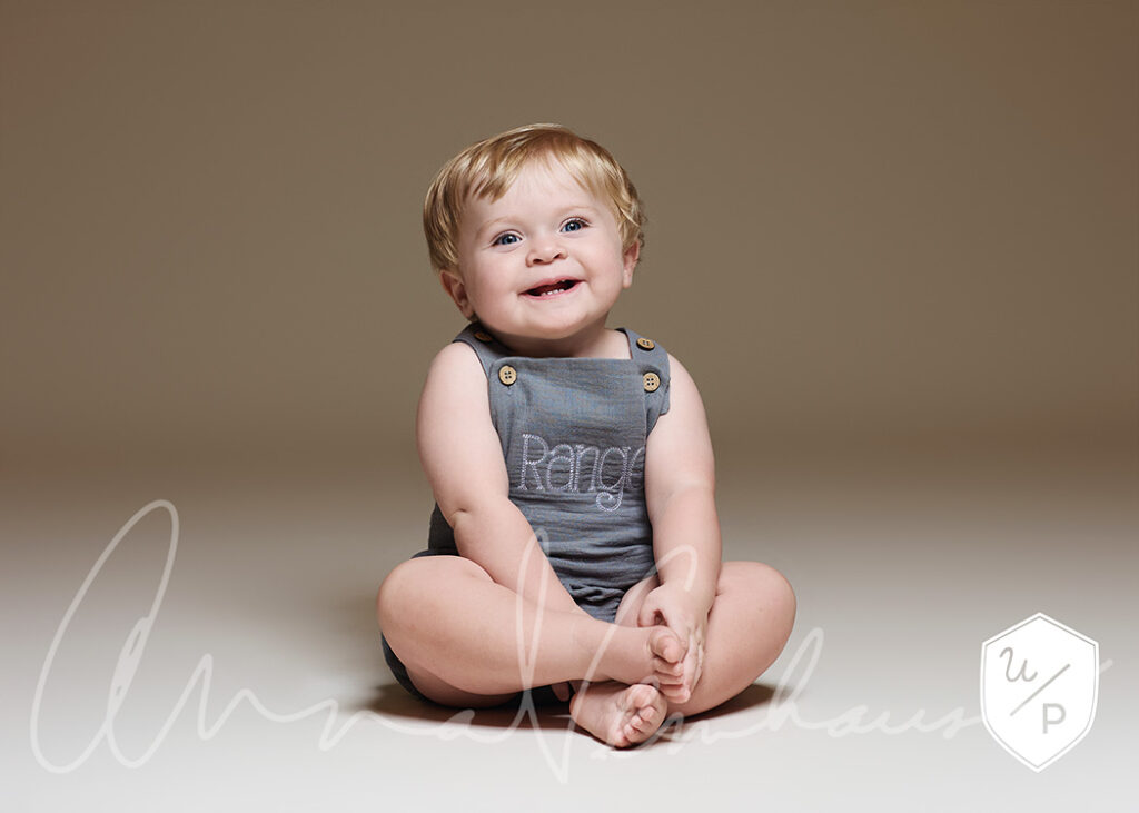 We started with some clean, classic portraits of him in the sweetest little overalls. Simple outfits like that let his expressions shine, and he gave us a great mix of curiosity, seriousness, and those adorable little smiles.